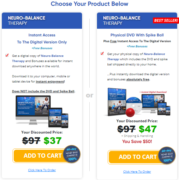 The Neuro-Balance Therapy program is available as a one-time digital purchase, usually priced around $49. Depending on the package, it may include bonus guides and the spike-ball nerve activation tool.